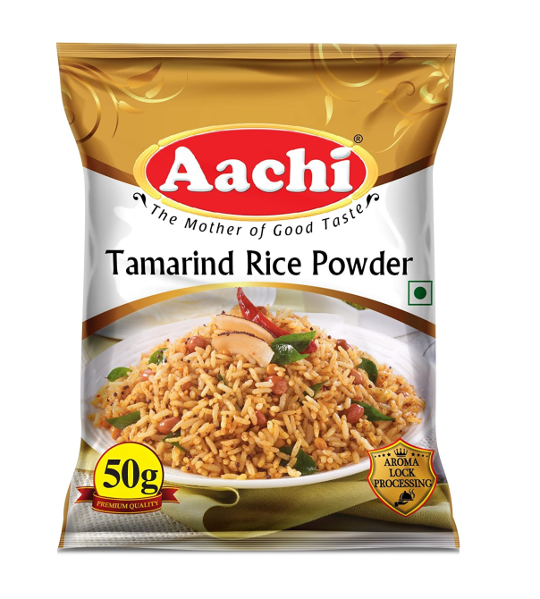 Aachi Tamarind Rice Powder is a pre-packaged spice mix specifically crafted to enhance the flavor of tamarind rice, also known as "puliyodarai" or "puliyogare" in South Indian cuisine. This powder typically contains a blend of spices such as tamarind, mustard seeds, urad dal (black gram), chana dal (split chickpeas), dried red chilies, curry leaves, turmeric, asafoetida, and sometimes fenugreek seeds.