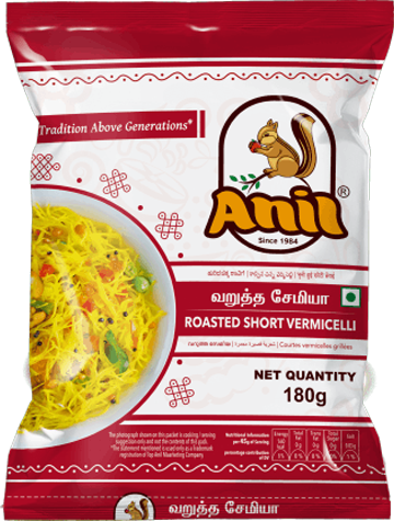 Anil Roasted Short Vermicelli is a type of thin noodle made from wheat flour that has been roasted for added flavor. It is commonly used in Indian cuisine to prepare dishes such as upma, kheer, and various savory and sweet dishes. The roasting process gives the vermicelli a slightly nutty taste and golden color, enhancing its overall flavor profile. Anil Roasted Short Vermicelli cooks quickly and has a soft yet firm texture, making it a convenient and versatile ingredient for various recipes.